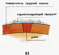 Перша допомога полягає в накладенні на рану герметизуючої пов'язки, яка перекриє доступ повітря [62]. Для цього використовуються липкий пластир, прогумована обгортка від індивідуального перев'язувального пакета, клейонка, целофан, серветки, добре просочені вазеліном, зафіксовані бинтом, косинкою або пластиром на грудній клітці над раною [63].