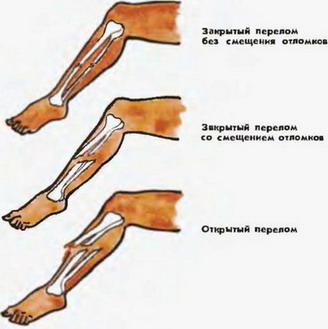 При переломі порушується цілість кістки, при цьому відламки її можуть залишатися на місці (перелом без зміщення) або зміщуватися, утворюючи викривлення кінцівок (перелом зі зміщенням). Переломи бувають також закриті (без ушкодження шкіри) і відкритими (з раною над місцем перелому) [85].