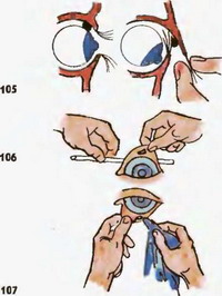 Не можна терти око, так як цим посилюється біль з-за додаткового подразнення кон'юнктиви. Слід оглянути очей і визначити місцезнаходження чужорідного тіла. Якщо вона розташована під верхнім століттям, видалити його можна, обережно потягнувши за вії верхню повіку донизу так, щоб його внутрішня сторона протерлася віями нижньої повіки при направленій вниз погляді потерпілого [105]. Якщо ефект не досягнуто, чужорідне тіло видаляється після того, як верхня повіка вивернуте способом, показаним на рисунку [106].
