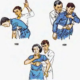 Сторонні тіла в дихальних шляхах небезпечні повної закупоркою останніх і розвитком задухи. Досить часто виникає при попаданні чужорідного тіла кашель сприяє його мимовільного видаленню. Якщо цього не відбувається, необхідно нанести потерпілому чотири швидких сильних удару долонею в межлопаточную область, утримуючи його іншою рукою в злегка нахиленому положенні [108]. Якщо і цей прийом виявляється неефективним, слід обхопити постраждалого за талію обома руками, зімкнутими в «замок», і зробити 3-4 натискання в середній частині живота в напрямку всередину і вгору [109]. При вираженому ожирінні треба аналогічним чином здавлювати грудну клітку [110]. Якщо неможливо викликати «швидку допомогу», ці заходи проводять до тих пір, поки не буде досягнутий позитивний ефект.
