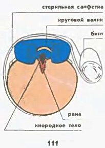Слід обмежитися накладанням на рану і навколо стороннього тіла стерильних серветок і акуратно закрити їх косинкою, бинтом або смужками пластиру [111]. При наявності в рані довгих чужорідних тіл, що значно підносяться над поверхнею шкіри, пов'язку слід накладати так, щоб не завдати додаткової травми. Терміново викликати «швидку допомогу».