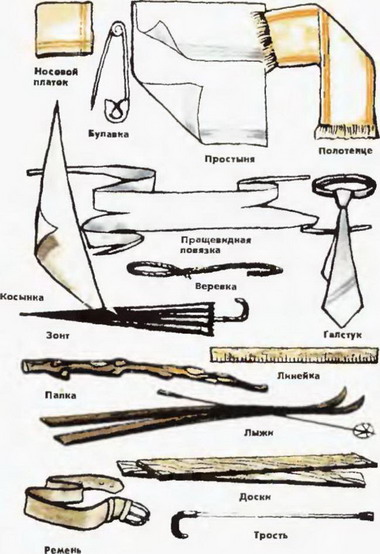 При терміновому наданні першої допомоги іноді доводиться застосовувати імпровізовані, тимчасові засоби. До них можна віднести предмети, зображені на малюнках [3], та багато інших. Вони використовуються у випадках, коли немає офіційних засобів першої допомоги або їх виявилося недостатньо для проведення всіх необхідних заходів у повному обсязі. Творчо використовуючи імпровізовані кошти, в переважній більшості випадків можна успішно вийти з скрутного становища при наданні допомоги на місці події.