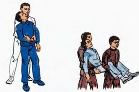 Потерпілого, що знаходиться в несвідомому стані, одному найбільш зручно транспортувати, утримуючи за передпліччя [121], удвох - переносити способом «один за одним» (якщо немає перелому хребта) [122].
