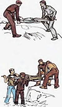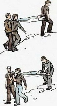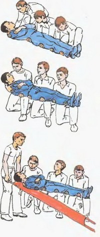 піднімати потерпілого слід обережно, підтримуючи знизу, краще за участю двох або більше осіб. Це особливо важливо при підозрі на пошкодження хребетного стовпа. Рухи повинні бути координовані. Піднімаючи потерпілого, необхідно підтримувати його тіло в максимальній кількості точок між головою і тазом [8]. Слід уникати ривків і постійно зберігати горизонтальне положення потерпілого. | |