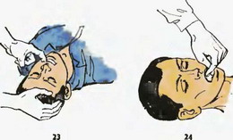 якщо щелепи потерпілого щільно стиснуті, розсуньте їх яким-небудь плоским предметом (наприклад, черешком ложки) або використовуйте прийоми, показані на малюнках. Вказівний палець введіть між щокою і останніми зубами [23]. Розкрити рот можна, розтискаючи зуби схрещеними пальцями [24];