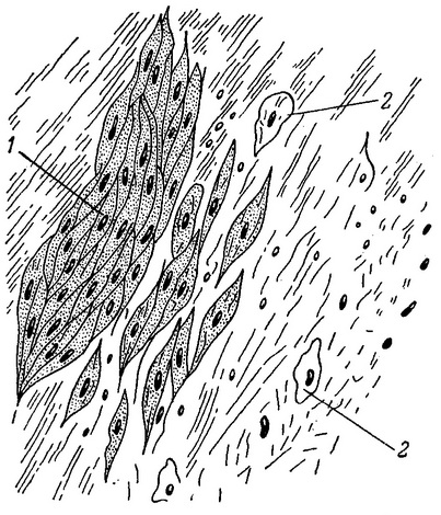 1 - пласти ладьевидных клітин, 2 - поодинокі проміжні клітини.
