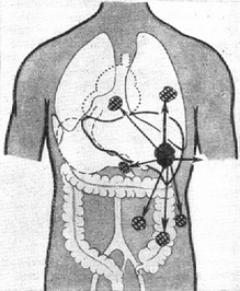![]() Рис. 29. Можливі напрямки прориву абсцесу печінки. |