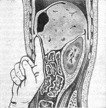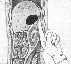 ![]() Рис. 31. Позаочеревинний доступ до абсцесу задньої поверхні печінки. |