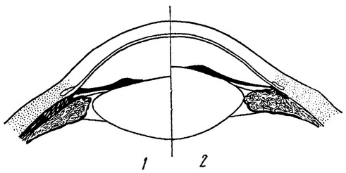 1 - кришталик в стані акомодації; 2 - кришталик в напрузі акомодації.