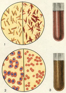 ![]() Рис. 1. Кристали: зліва - солянокислого геміну; праворуч - гемохромогена. Рис. 2. Еритроцити: зліва - гусака; праворуч - людини. Рис. 3. Проба з таніном: вгорі - кров з карбоксигемоглобином; внизу - нормальна кров. |