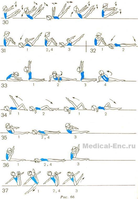 33. І.п. сидячи, розслаблено нахилившись вперед, руки покласти на шкарпетки ніг. Випрямитися, підняти руки вгору і злегка прогнутися. Повернути тулуб праворуч і різкий переворот вправо всім тілом до упору лежачи. Повернутися в і. п., відпочити. Те ж в іншу сторону.