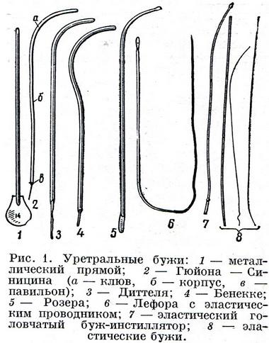 Уретральні бужі (для розширення звужень сечівника) бувають металеві з нержавіючої сталі або латуні; еластичні, або гнучкі, з плетеними шовкової або бавовняної основи, просоченої копаловым лаком, або з пластичних мас (полівінілхлорид, поліетилен). У бужей розрізняють дзьоб, корпус і павільйон, або рукоятку (рис. 1).