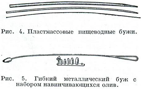 Бужі стравоходу застосовують для бужування стравоходу з метою діагностики і лікування звужень. Стравохідні бужі випускаються в наборах. Частіше використовують напівтверді гнучкі бужі з пластмаси марки КМПЗ зразка 1962 р. довжиною 60-80 см і завтовшки 0,3 -1,5 див. Форма їх циліндричні з конічним кінцем (рис. 4). Гнучкі металеві бужі з набором навинчивающийся олів різного діаметру (мал. 5) застосовують для визначення ступеня і рівня звуження стравоходу.