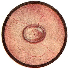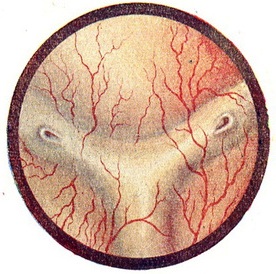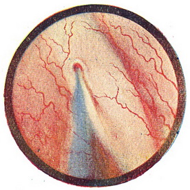 Устя сечоводів мають щілиноподібну форму. У цистоскоп можна бачити їх періодичні розширення, що супроводжуються викиданням цівки сечі, безбарвною в нормі, пофарбованої в червоний колір при ниркових кровотечах (рис. 33), синій - при индигокарминовой пробі (рис. 34).