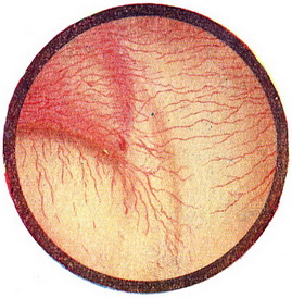 Нормальна слизова оболонка сечового міхура має світло-рожевий колір, вона гладка і злегка блищить. На тлі її видно мережу дрібних судин (рис. 29).