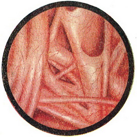 ![]() Рис. 32. Густа судинна мережа в області лівої половини протоки трикутника. У верхівки трикутника видно устя лівого сечоводу. |