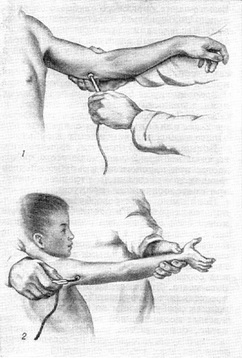 ![]() Рис, 8. Найбільш зручні положення руки (1-2) для дослідження электровозбудимости. |