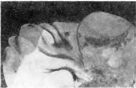 ![]() Рис. 8. Печінка різко збільшена, із закругленими краями, точкові крововиливи під капсулою. |