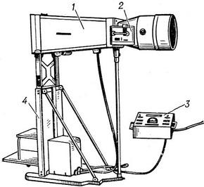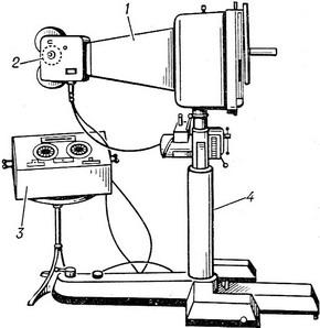 ![]() Рис. 2. Малокадровый флюорограф Ф-55: 1 - тубус; 2 - камера; 3 - пули управління; 4 - штатив. |