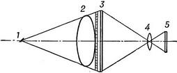 ![]() Рис, 1. Схема отримання флюорограми: 1 - джерело рентгенівських променів; 2 - об'єкт просвічування; 3 - рентгенівський екран з відсікаючої ґратами; 4 - оптична система фотокамери; 5 - плівка (флюорограм). |
