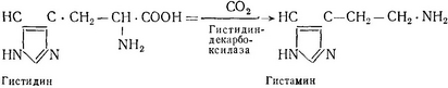 Гістидин під впливом специфічного ферменту гістидин-декарбоксилази, яка знаходиться в тканинах у великій кількості перетворюється в гістамін: