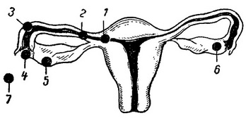 1 - graviditas interstitialis; 2 - graviditas tubaria (istmica); 3 - graviditas tubaria (ampullaris); 4 - graviditas fimbriaca; 5 - graviditas ovarica; 6 - graviditas tuboovarialis; 7 - graviditas abdominalis.