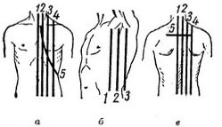 ![]() Рис. 2. Умовні лінії для орієнтування на грудній клітці: а - на передній поверхні (1 - серединна передня, 2 - грудинная, 3 - окологрудинная, 4 - среднеключичная, 5 - реберно-суглобова); б - на бічній поверхні (1 - передня, 2 - середня 3 - задня подкрыльцовые); в - на задній поверхні (1 - задня серединна, 2 - околопозвоночная, 3 - чрезлопаточная, 4 - лопаткова, 5 - межлопаточная). |