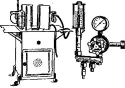 ![]() Рис. 3. Пересувна інгаляційна установка. Рис. 4. Редуктор до балонів з киснем та стиснутим повітрям. |