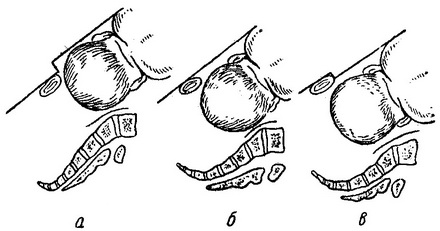 Для з'ясування співвідношень між величиною головки і розмірів входу в таз слід визначити ступінь выстояния головки над передньою периферією кісткового тазу, або так зване нависання головки над лоном (ознака Ст. А. Васта) (рис. 19).