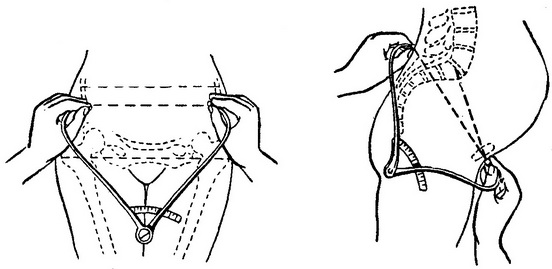 При вимірюванні зовнішнього прямого розміру тазу (conjugata externa) жінка знаходиться у положенні на боці; при цьому одна нога (нижня) повинна бути зігнута в тазостегновому і колінному суглобах, а інша нога (верхня) витягнута. Одну ніжку циркуля ставлять на передню поверхню симфізу поблизу його верхнього краю, а іншу - в поглиблення (зв'язку) між останнім поперековим I і крижовим хребцем (верхній кут ромба Міхаеліса) (рис. 14). Зовнішній прямий розмір, або зовнішня кон'югата, дорівнює 20-21 див. Вимірювання зовнішньої кон'югати дозволяє побічно судити про розмір істинної кон'югати (conjugate vera). Для визначення розміру істинної кон'югати рекомендується відняти з цифри зовнішнього прямого розміру 9,5-10 див. Однак таке визначення conjugata vera неточно і є лише орієнтовним. Внутрішній прямий розмір (conjugata vera) дорівнює 11 див.
