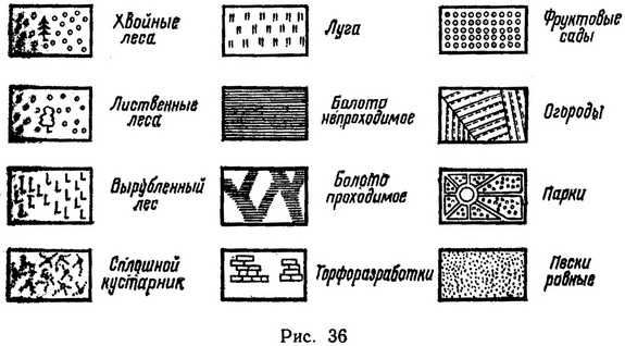 1) Контурні або масштабні знаки (рис. 36), ними позначаються великі за розмірами об'єкти, які можуть бути виражені в масштабі карти,- ділянки лісу, луки, ниви, озера, болота, великі річки, піски і т. д. Межі їх контурів позначаються суцільними лініями або крапками у відповідності з дійсними обрисами на місцевості. Площа всередині контуру покривається відповідними фарбами і заповнюється додатковими умовними знаками.