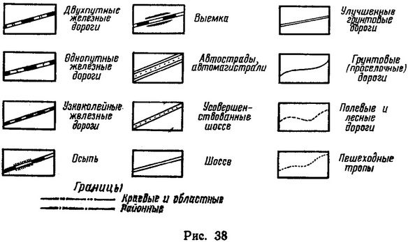 3) Дороги, стежки, струмки, лінії електропередач та інші лінійні зображення, масштаб яких відображає тільки довжину, займають проміжне положення між масштабними і внемасштабными знаками й називаються лінійними (рис. 38).