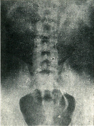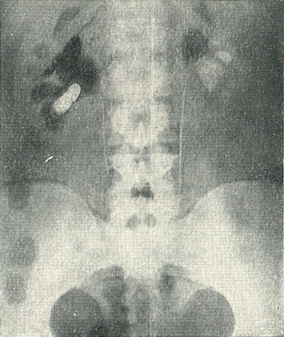 ![]() Рис. 93. Пневмопиелограмма: на тлі кисню, що заповнює чашково-мискову систему, ясно видно камінь, який не давав тіні на оглядовому знімку. |