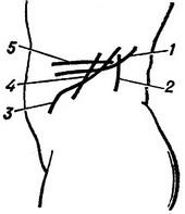 ![]() Рис. 3. Оперативні доступи до нирки: 1 - розріз Федорова; 2 - розріз Симона; 3 - розріз Бергмана-Ізраеля; 4 - розріз Черні; 5 - розріз Пеана. |
