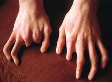Вроджені каліцтва кисті різноманітні. Повна відсутність кисті (ахеирия) зустрічається рідко. Значно частіше спостерігається полідактилія - многопалость (рис. 4). Вроджене зменшена кількість пальців називають олигодактилией. При відсутності одного або декількох пальців з відповідними п'ястно кістками утворюється вилообразная розщеплена кисть - «клешня рака». Пальці при вроджених потворність кисті можуть мати нормальну форму, в ряді випадків вони недорозвинені або потворні. Ненормально короткі пальці називають микродактилией, надмірно довгі - макродактилией. Нерідко зустрічається вроджена зрощення пальців - сіндактилія (рис. 5). Пальці можуть бути з'єднані між собою тільки шкірної перемичкою (перетинчаста форма синдактилии), покриті загальним шкіряним чохлом (шкірна форма) або може мати місце кісткове зрощення фаланг (кісткова форма). Спостерігається також вроджена косорукість (див.). Лікування синдактилии та деяких інших каліцтв пальців і кисті оперативне.