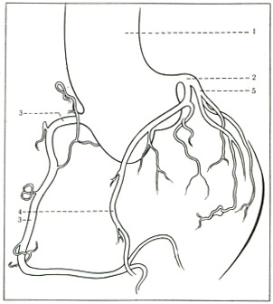392. Коронарографія серця (прижиттєва рентгенограма) (К. Б. Тихонову). 1 - аорта; 2 - ліва вінцева артерія; 3 - права вінцева артерія; 4 - передня міжшлуночкова гілка; 5 - огинаюча гілка.