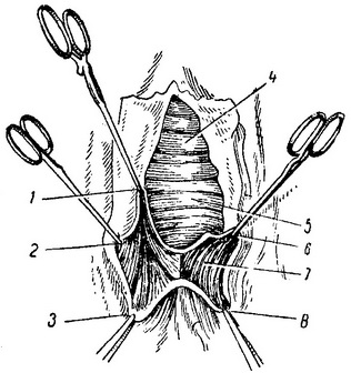 1 - верхній край розриву; 2,6 - задня спайка; 3, 8 - розійшлися ділянки заднього проходу; 4 - columna rugarum auterior; 6 - columna rugarum posterior; 7 - волокна розірваного сфінктера.