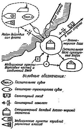 його базування, включаючи госпіталізацію і лікування уражених і хворих, які надходять з кораблів і медпунктів берегових частин. У її складі знаходяться стаціонарні (базові) військово-морські госпіталі, рухливі мед. формування типу польових рухливих госпіталів і груп посилення, санітарно-транспортні підрозділи. Крім того, уражені і хворі зі складу сил флоту при необхідності направляються в лікувальні установи сухопутних військ. Морська мед. евакуація забезпечується санітарно-транспортними судами різного типу і санітарною авіацією. При необхідності забезпечити сили флоту, що діють у великому відриві від своїх берегових баз, в їх склад можуть бути включені госпітальні суду (плавучі госпіталі).