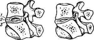 ![]() Положення пульпозного ядра в міжхребцевому диску: зліва - в нормі; праворуч - при стисненні його і утиску. 1 - міжхребцевий хрящ, або диск; 2 - фіброзне кільце; 3 - пульпозне ядро. |