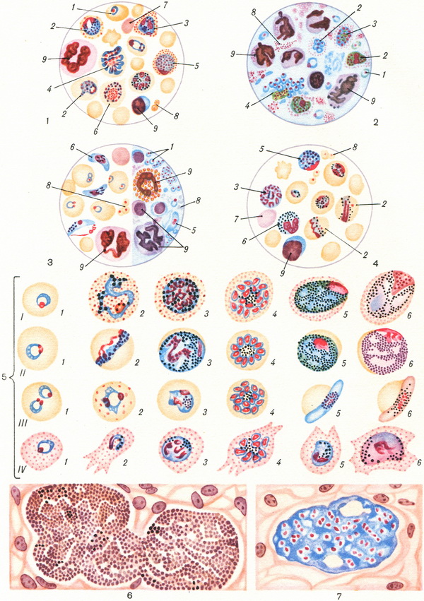 Еритроцитарна шизогонія (цветн. рис. 6 і 7). Тканинні мерозоиты проникають в еритроцит і утворюють шизонти, які розпадаються на еритроцитарні мерозоиты. Еритроцити руйнуються і звільнилися мерозоиты поселяються в нових еритроцитах.