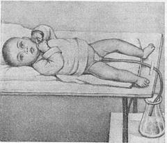 Сечоприймачі для дітей. Для збирання сечі у дітей старшого віку цілком прийнятні сечоприймачі для дорослих. Для дітей грудного віку потрібні спеціальні сечоприймачі, так як сечовипускання у них є мимовільним актом. Для отримання у дівчаток одноразовій порції сечі можна використовувати шірокогорлую колбу. В неї опускають один кінець гумової трубки, а інший пластиром прикріплюють до промежини і лобка так, щоб отвір сечовипускального каналу знаходилося в отвори трубки (рис. 2). Для збирання сечі у хлопчиків під дитини підкладають ретельно промите гумове судно, в середину якого ставлять лоток. Для прискорення сечовипускання оголюють живіт і м'яко натискають пальцем на верхівку сечового міхура над лобком. Для збирання сечі (як у дівчаток, так і у хлопчиків) приймальний посудину виноситься за межі ліжечка дитини і за допомогою трубки з'єднується з мочеприемником.