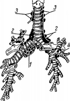 Рис. 48. Топографія медіастинальних лімфатичних вузлів (за Сукенникову). 1 - нижні трахео-бронхіальні; 2 - верхні трахео-бронхіальні; 3 - паратрахеальние; 4 - бронхопульмональні вузли. |