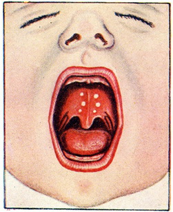 ![]() Рис. 1. Жовтувато-білі точки вздовж середньої лінії твердого неба. |