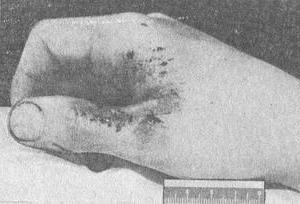 ![]() Рис. 73. Закапчивание при кисті після розриву саморобного пістолета - «підпалу» в момент пострілу |