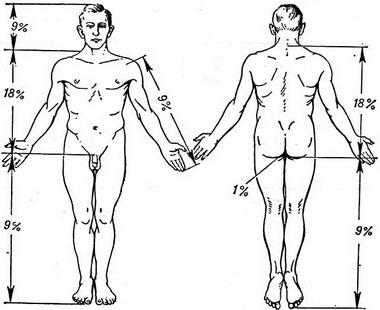 Для приблизного визначення площі опіку при наданні долікарської допомоги може служити розрахунок за так званим правилом дев'яток (мал. 1). Якщо всю поверхню шкіри людини прийняти за 100%, то на голову і шию припадає 9%, на верхню кінцівку - 9%, на нижню - 18%, на задню і передню поверхні тулуба - по 18%, промежина і статеві органи - 1 %. Розрахунок цей дуже приблизний, але дозволяє об'єктивно, хоча і грубо, оцінити широту опіку.