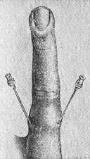 ![]() Рис. 2. Місця ін'єкцій для знеболювання при розтині панарицію. |
