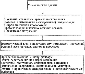 Як випливає з представленої схеми, до пускових механізмів травматичного шоку можуть бути віднесені больова і надлишкова (афферентная) імпульсація з вогнищ анатомічних руйнувань, кровотеча і гостра крововтрата, безпосередня травматизація життєво важливих органів, емоційний стрес - психічне потрясіння, пов'язане зі своєрідністю обстановки, природною реакцією потерпілого на травму і його турботою про кінець захворювання і подальшої своєї долі.