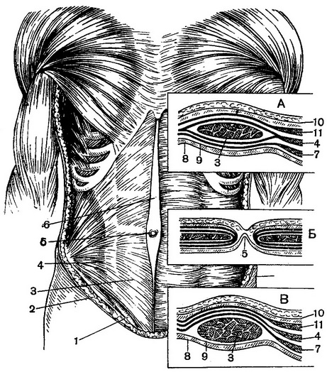 Рис. 128. Передня черевна стінка і освіта піхви прямого м'яза живота. А - вище полукружной лінії; Б - на рівні пупка; В - нижче полукружной лінії. 1 - сім'яний канатик; 2 - пахова зв'язка; 3 - прямий м'яз живота з піхвою: 4 - внутрішній косий м'яз; 5 - пупок; 6 - біла лінія; 7 - поперечний м'яз живота; 8 - очеревина; 9 - поперечна фасція; 10 - поверхнева фасція; 11 - зовнішній косий м'яз.