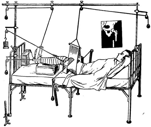 Рис. 63. Система скелетного витягнення при лікуванні переломів стегна в середній третині.
