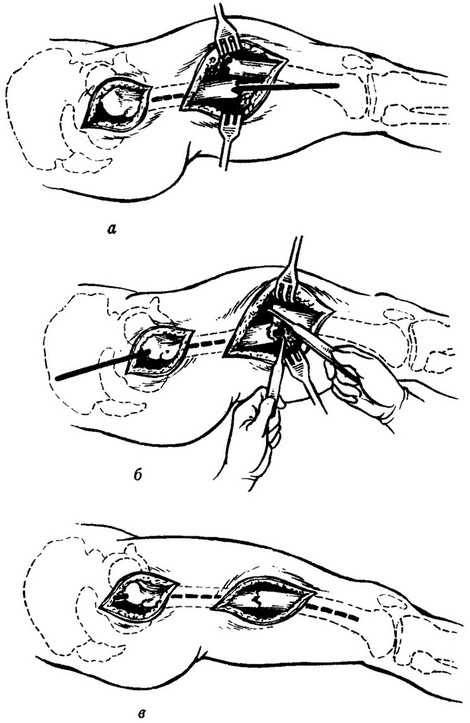 Розрізом по зовнішній поверхні стегна оголюють місце перелому. Виділяють кінець проксимального уламка і вводять в нього металевий штифт. Ударами молотка просувають його вгору до виходу штифта над великим рожном. Розтинають шкіру над кінцем штифта і виводять його в рану до тих пір, поки дистальний кінець штифта виявиться на рівні площини зламу. Потім відламки зіставляють і ударами молотка по проксимального кінця штифта вводять його в дистальний уламок стегнової кістки. Введений штифт повинен щільно фіксувати відламки, бути досить довгим, щоб увійти в костномозговой канал дистального уламка на глибину не менше 6-8 см, і бути досить коротким, щоб дистальний кінець штифта не проник в колінний суглоб.